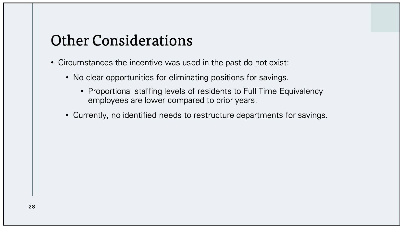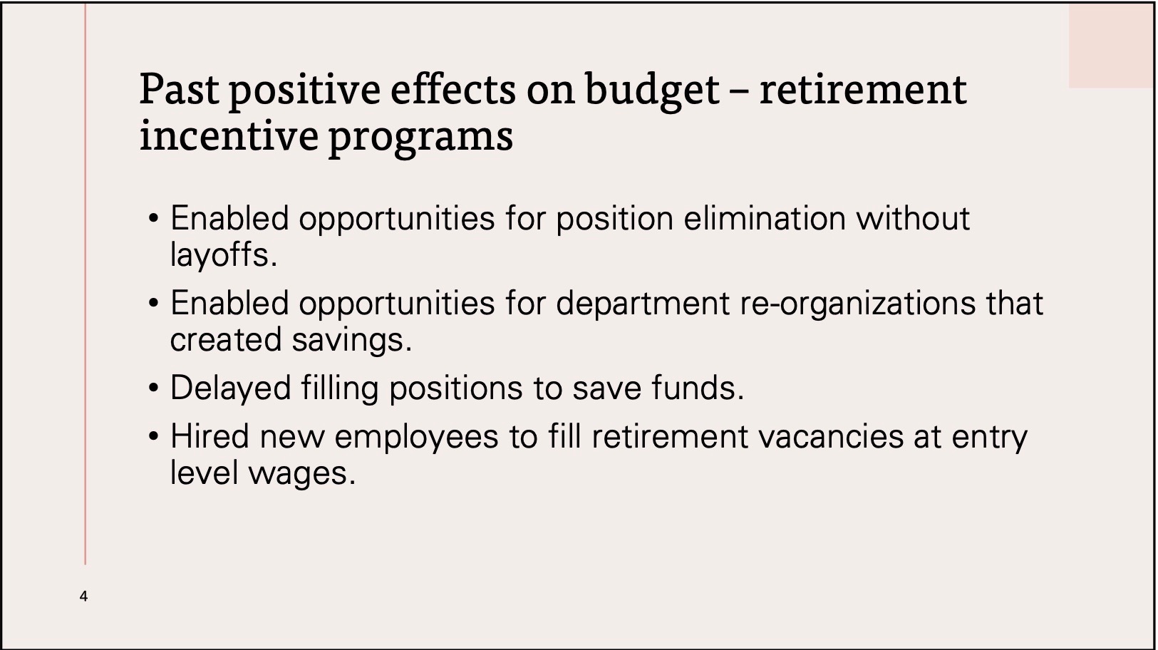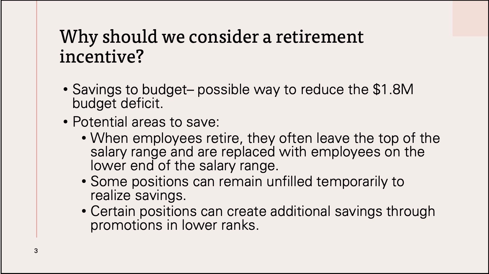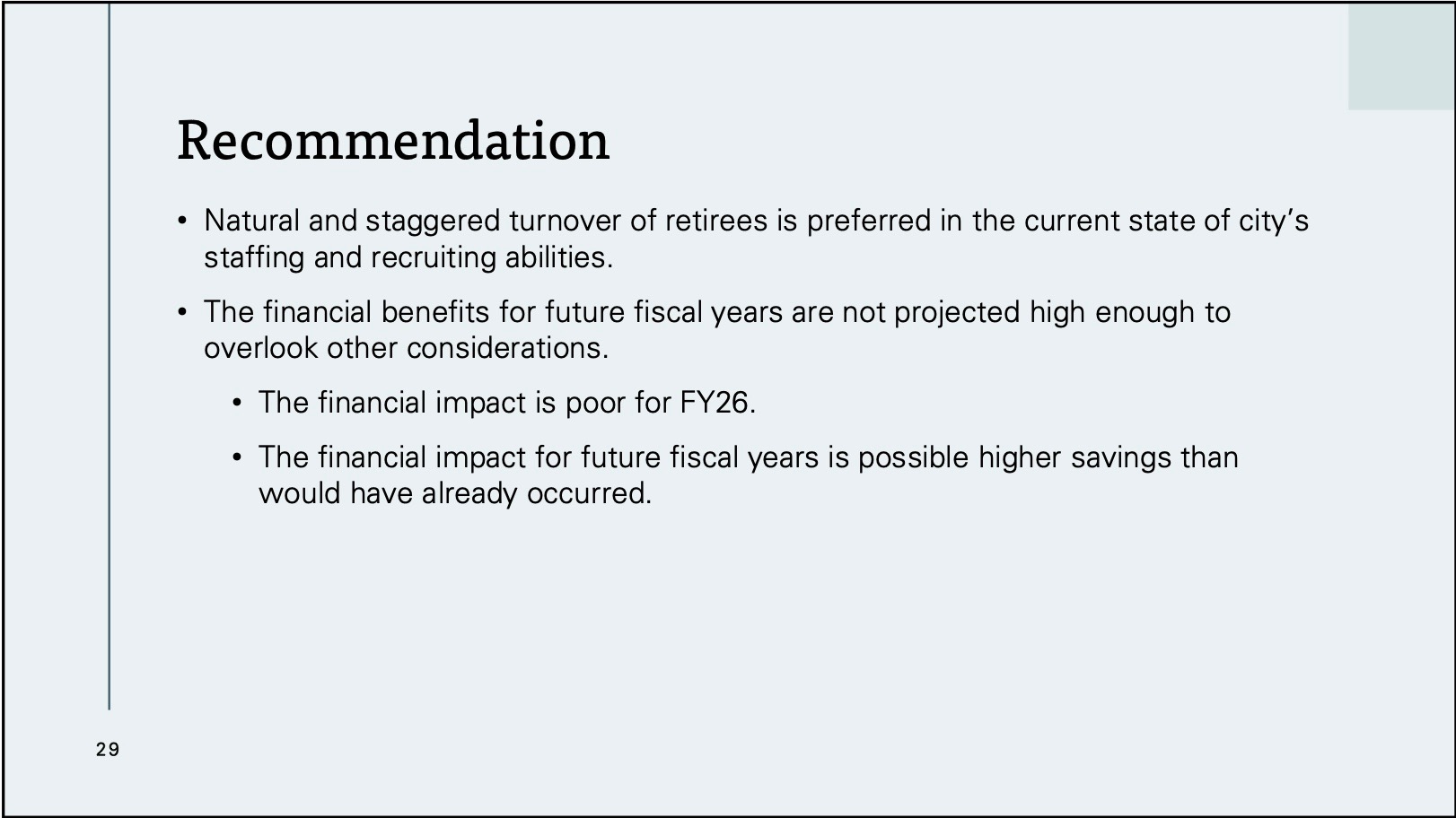 “Natural and staggered turnover of retirees is preferred in the current state of city’s staffing and recruiting abilities.”