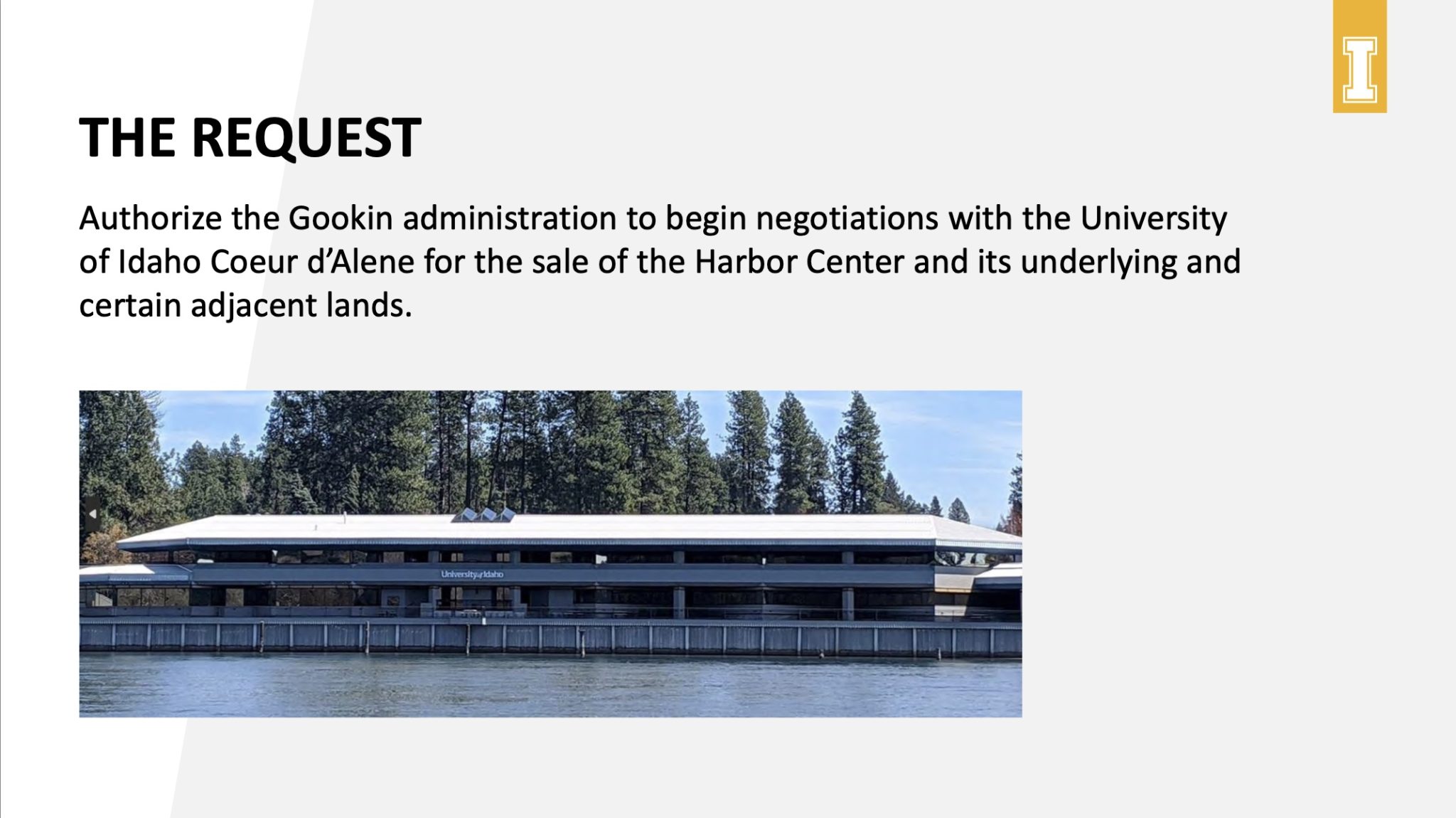 University of Idaho Dr. Andrew Fields will pitch the sale of the Harbor Center and surrounding lands from the city to University of Idaho.